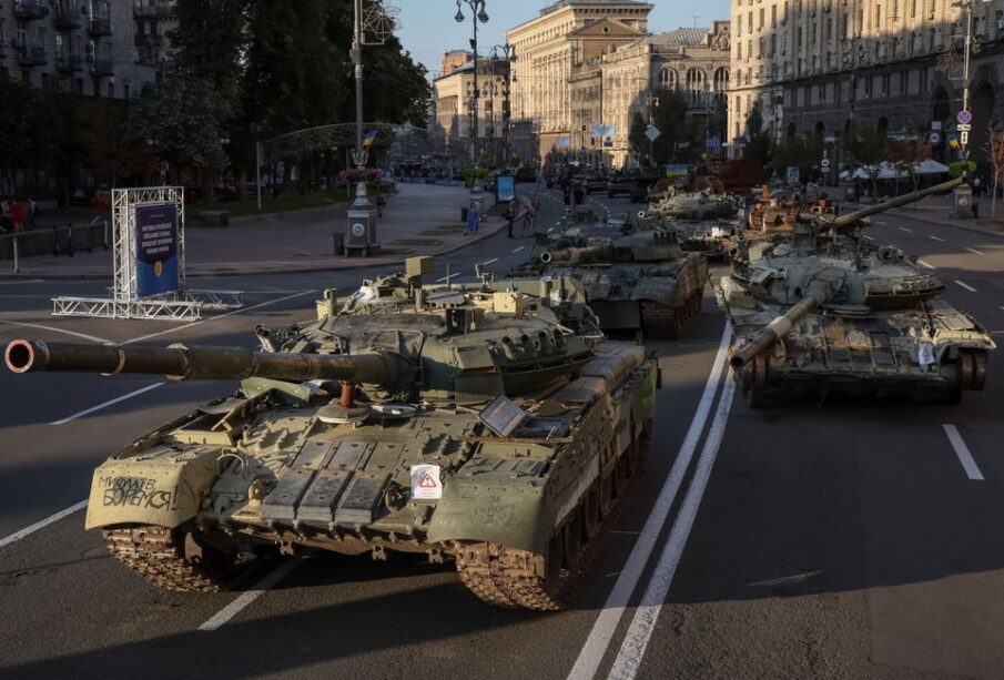 The government laid out the hulks of burnt-out Russian tanks and armoured vehicles like war trophies in central Kyiv in a show of defiance.