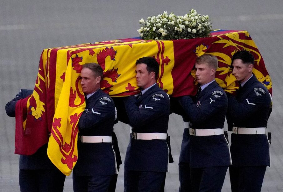 The coffin of Queen Elizabeth II is carried off a plane by the Queen's Colour Squadron at RAF Northolt in London, to be taken to Buckingham Palace, Tuesday, Sept. 13, 2022. Kirsty Wigglesworth/Pool via REUTERS