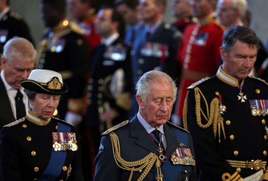 In a group that followed were Charles’s sons Princes William and Harry, a doleful scene reminiscent of when, as boys 25 years ago, they followed the casket of their mother Princess Diana when it was taken on a similar procession through central London.
