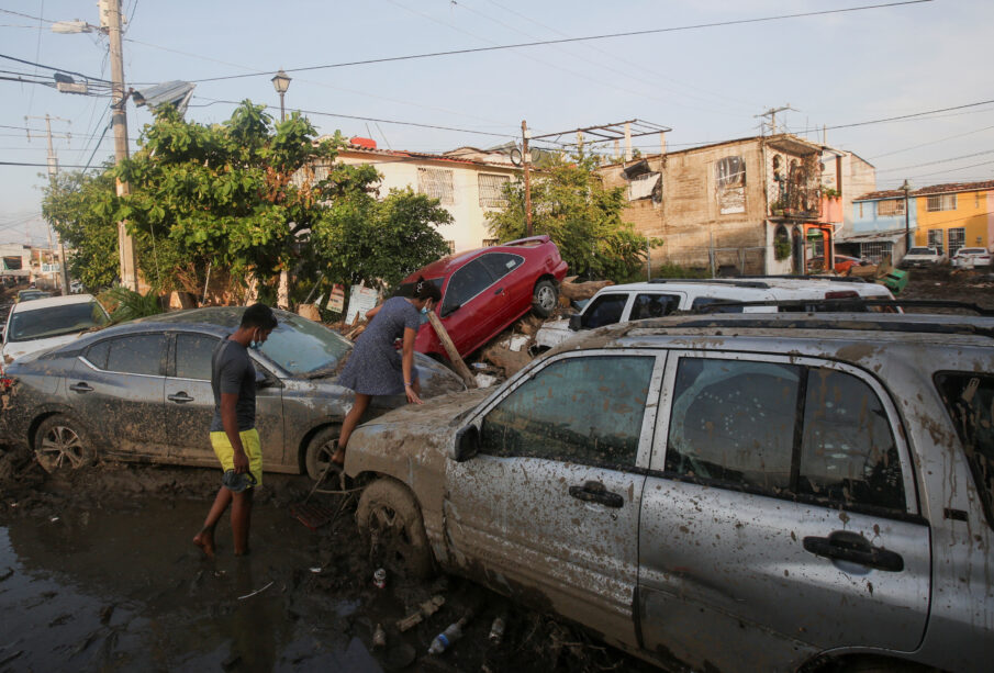 A woman climbs over a car stuck in the mud, in the aftermath of Hurricane Otis, in Acapulco, Mexico, October 29, 2023. REUTERS/Quetzalli Nicte-Ha