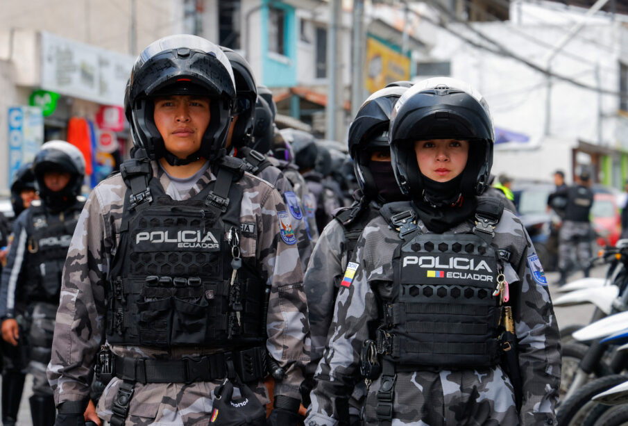 Police officers stand in formation outside El Inca prison after a security operation due to riots, following the disappearance of Jose Adolfo Macias, alias 'Fito', leader of the Los Choneros criminal group, in Quito, Ecuador, January 8, 2024. REUTERS/Karen Toro