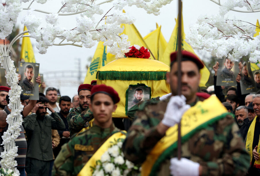 FILE PHOTO: Members of Hezbollah carry the coffin of Hezbollah member Jaafar Serhan, who was killed while deployed in Syria with Hezbollah, during his funeral in Mashghara, Lebanon November 13, 2023. REUTERS/Aziz Taher/File Photo