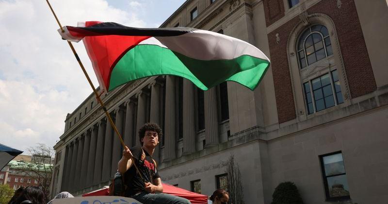 A student waves a flag during a march on Columbia University campus in support of a protest encampment supporting Palestinians, despite a 2pm deadline issued by university officials to disband or face suspension, during the ongoing conflict between Israel and the Palestinian Islamist group Hamas, in New York City, U.S., April 29, 2024. REUTERS/Caitlin Ochs By Julia Harte Reuters