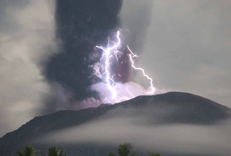 Mt. Ibu erupted on Saturday evening, sending ash 4 km (2.5 miles) high, as streaks of purple lightning flashed around its crater, according to information and images shared by Indonesia’s volcanology agency.