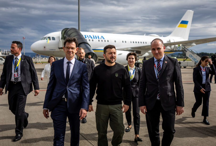 Ukrainian President Volodymyr Zelenskiy is accompanied by Ambassador of Switzerland to Ukraine Felix Baumann, Deputy Head of Swiss Protocol Manuel Irman, and Ukrainian Ambassador to Switzerland Iryna Venediktowa, as he arrives at Zurich airport, Switzerland June 14, 2024. Zelenskyy will attend the Summit on Peace in Ukraine conference to be held on June 15 and 16 at the Buergenstock Resort in central Switzerland. Michael Buholzer/Pool via REUTERS