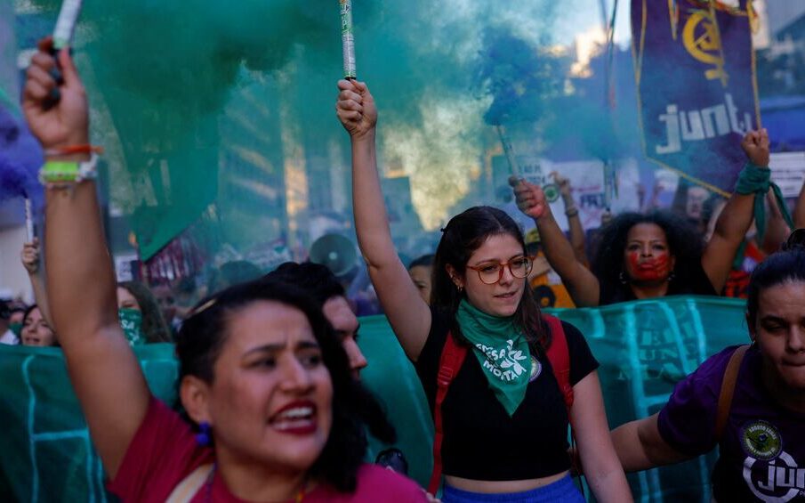 Thousands of women protested on Saturday against a bill advancing in Brazil’s conservative Congress that would equate abortions after 22 weeks of pregnancy to homicide and establish sentences of six to 20 years in prison.