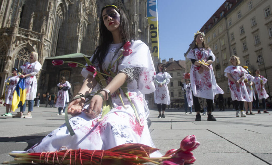 Ukrainian demonstrators protest in Vienna in April 2022 against rapes of Ukrainian women by Russian soldiers (Alex HALADA/AFP)