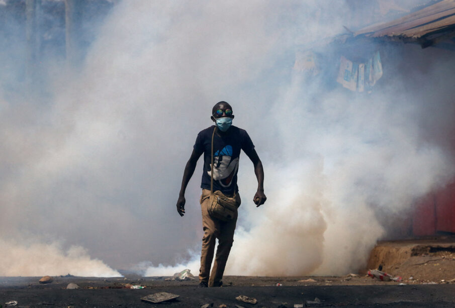 FILE PHOTO: A protester walks amid smoke as supporters of Kenya's opposition leader Raila Odinga of the Azimio La Umoja (Declaration of Unity) One Kenya Alliance, participate in an anti-government protest against the imposition of tax hikes by the government in Nairobi, Kenya July 21, 2023. REUTERS/Thomas Mukoya/File Photo