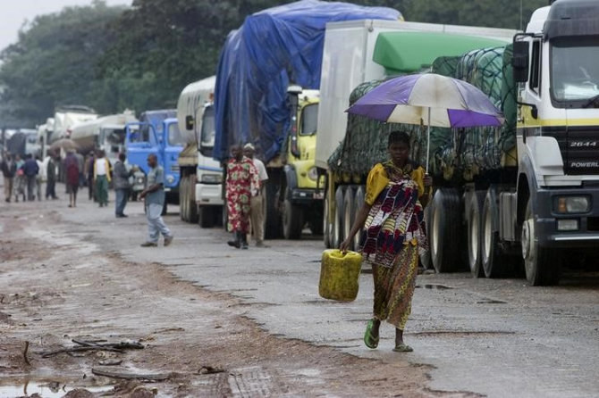 A woman walks past trucks waiting to cross into the Democratic Republic of Congo from Zambia at the Kasumbalesa border post. (Reuters/File)