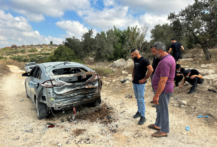 Palestinians assess the damage of a car during a military operation by Israeli forces near Jenin in the Israeli-occupied West Bank August 28, 2024. REUTERS/Ali Sawafta