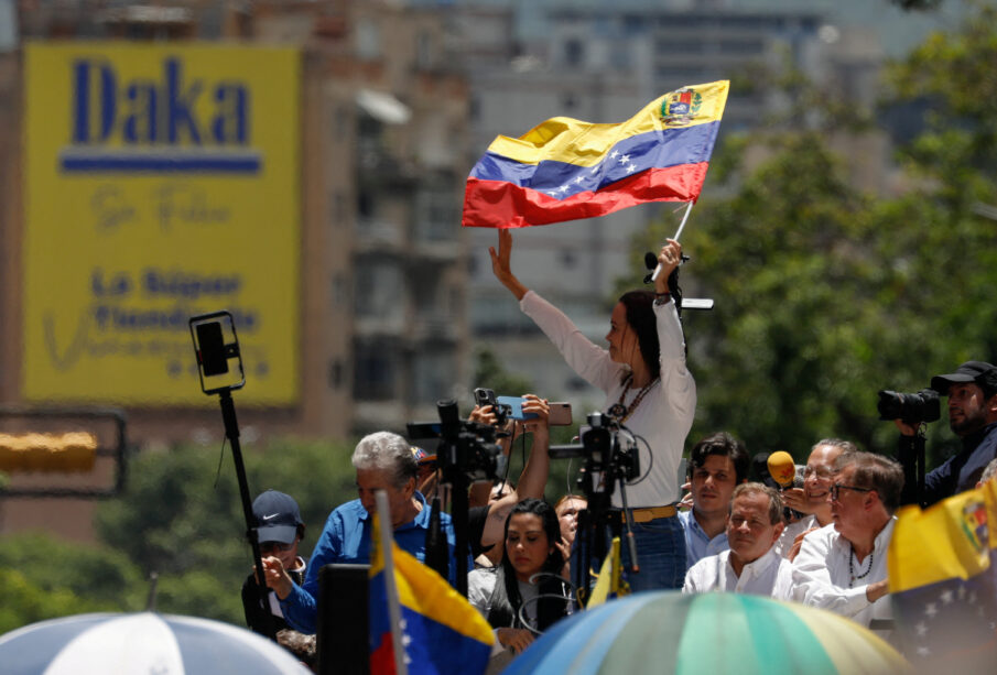 Venezuelan opposition leader Maria Corina Machado waves a flag during a protest against the election results announced by President Nicolas Maduro's government after he was declared winner of the election, in Caracas, Venezuela August 28, 2024. REUTERS/Leonardo Fernandez Viloria