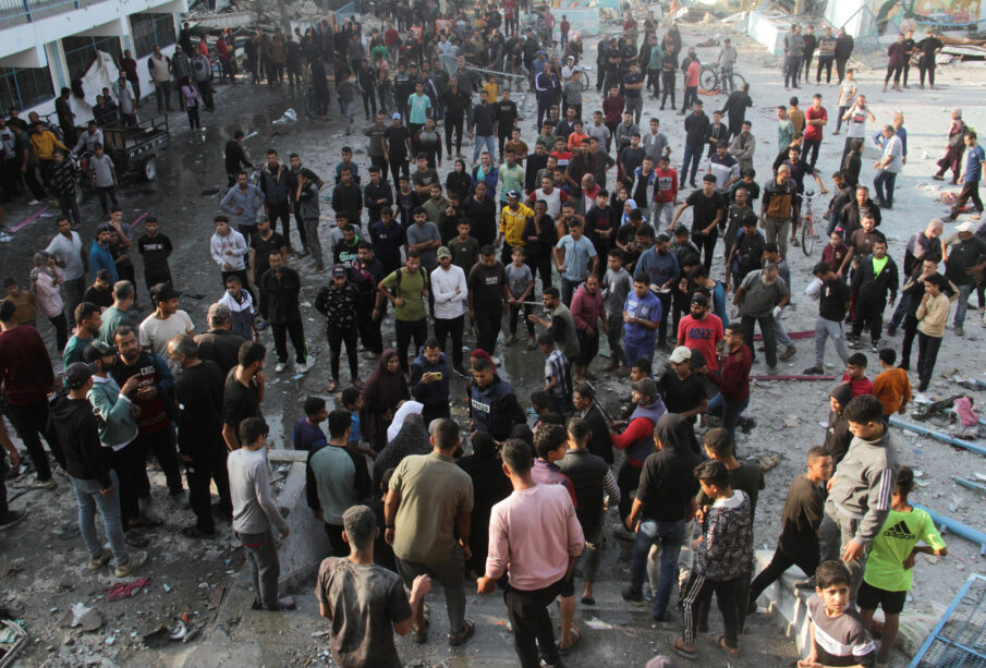 Palestinians gather after a school sheltering displaced people was hit by an Israeli strike, at Beach camp in Gaza City November 7, 2024. REUTERS/Mahmoud Issa