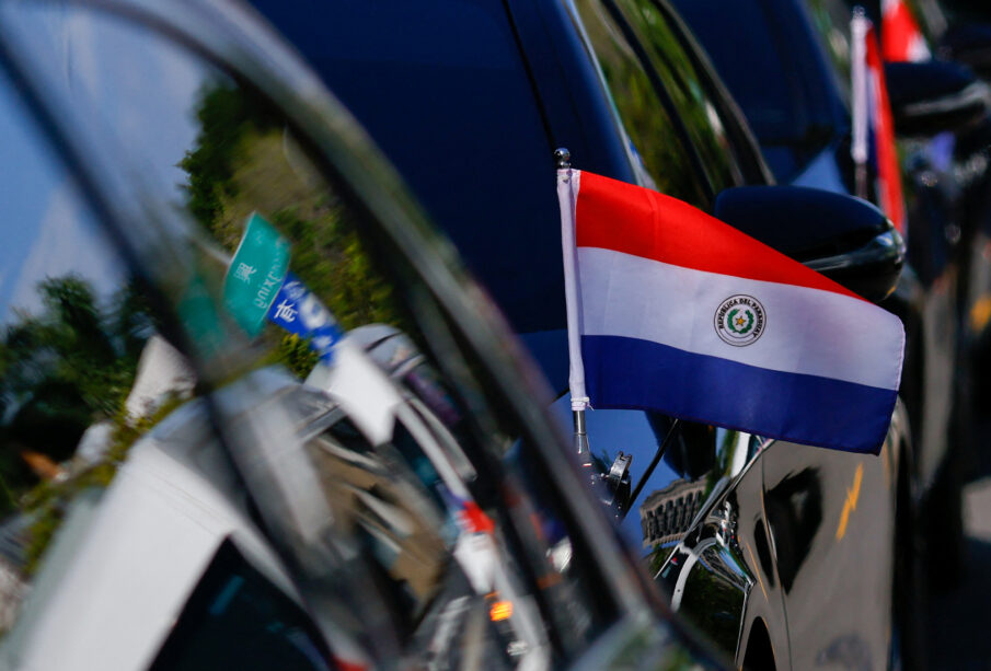The flag of Paraguay is seen on a car in Taichung, Taiwan, during a visit by Paraguayan President-elect Santiago Pena Palacios, on July 14, 2023. © Reuters
