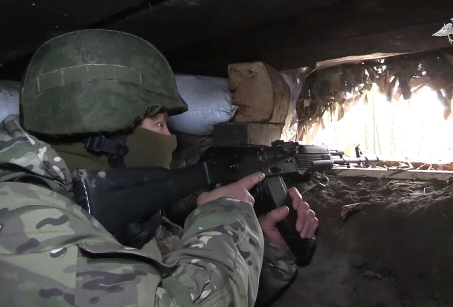 In this photo taken from video released by the Russian Defense Ministry on Thursday, Oct. 24, 2024, a Russian soldier aims from a bunker in the Russian - Ukrainian border area in ​​the Kursk region, Russia. (Russian Defense Ministry Press Service photo via AP)