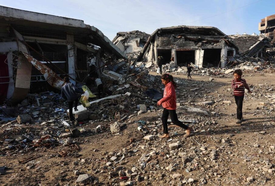 Palestinian children run amid the destruction in the Shujaiya neighbourhood of Gaza City, in the northern Gaza Strip on January 4, 2025, as the war between Israel and Hamas militants continues. | Photo Credit: AFP