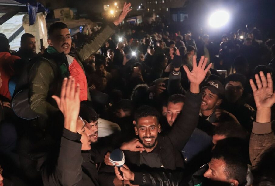 Palestinians celebrate the imminent announcement of a ceasefire deal between Hamas and Israel in Khan Younis, central Gaza Strip, Wednesday, Jan. 15, 2025. (AP Photo/Mariam Dagga)
