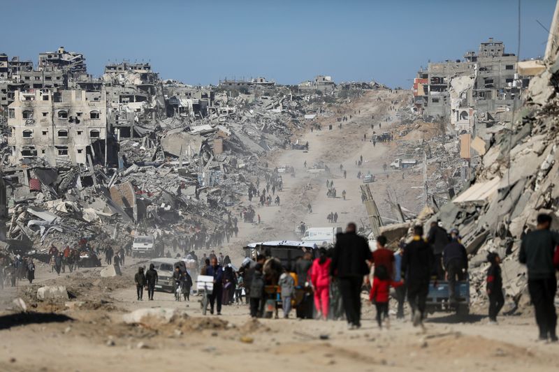 Palestinians make their way past the rubble of destroyed houses and buildings, following a ceasefire between Israel and Hamas, in Jabalia in the northern Gaza Strip, January 21, 2025. REUTERS/Dawoud Abu Alkas
