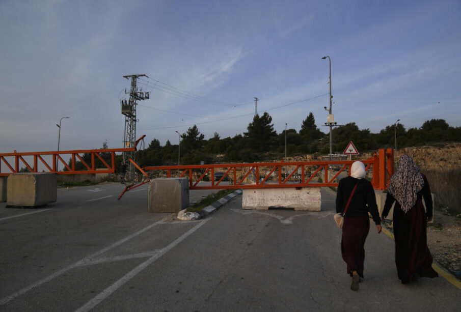 Palestinian women pass an Israeli army iron gate on foot near the West Bank town of Birzeit, Sunday, Feb. 2, 2025. (AP Photo/Nasser Nasser)