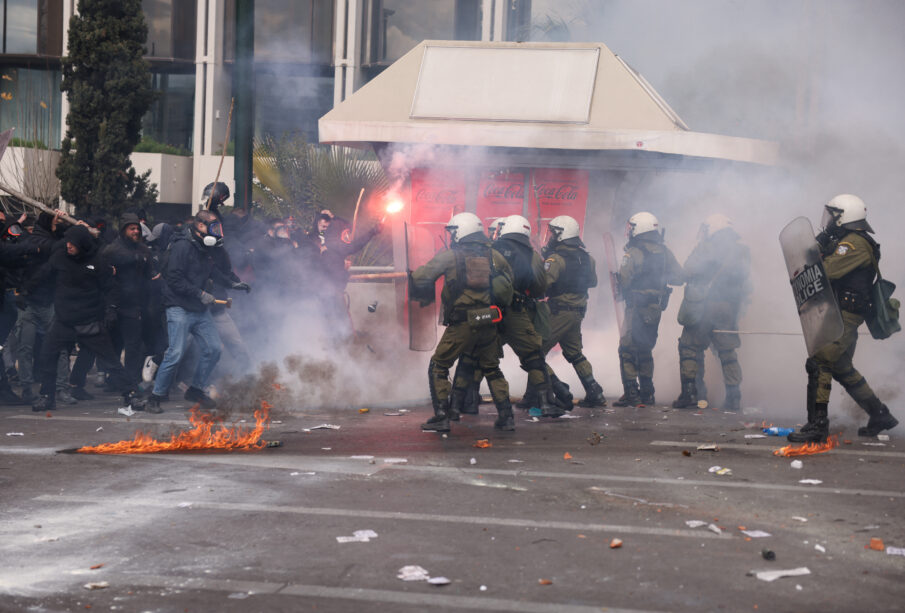 Clashes broke out in Athens on Friday as hundreds of thousands of people rallied across Greece to demand justice on the second anniversary of the country’s deadliest-ever train crash, and striking workers brought air, sea and rail transport to a halt.