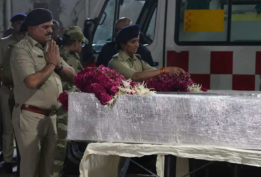 Police officers pay tribute to the victims who were killed by militants near Pahalgam in Indian-controlled Kashmir, after the bodies arrived at an airport in Ahmedabad, India, Wednesday, April 23, 2025. (AP Photo)