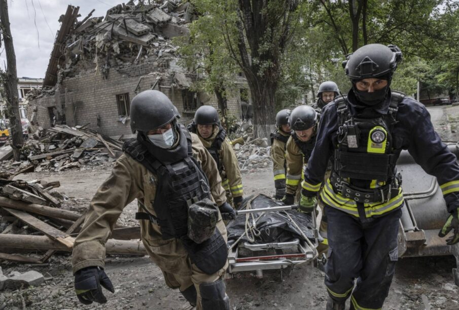 Ukrainian firefighter and rescue workers carry a victim of a Russian airstrike that hit an apartment building in Karamtorsk, Ukraine, about 15 miles north of the city of Kostyantynivka, June 22, 2025. Ukraine is defending Kostyantynivka from drone attacks as it struggles to hold the line on their eastern front. (David Guttenfelder / The New York Times)