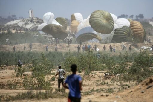 Palestinians rush to the site where parachuted aid packages in the Nuseirat area in the central Gaza Strip (Eyad BABA)