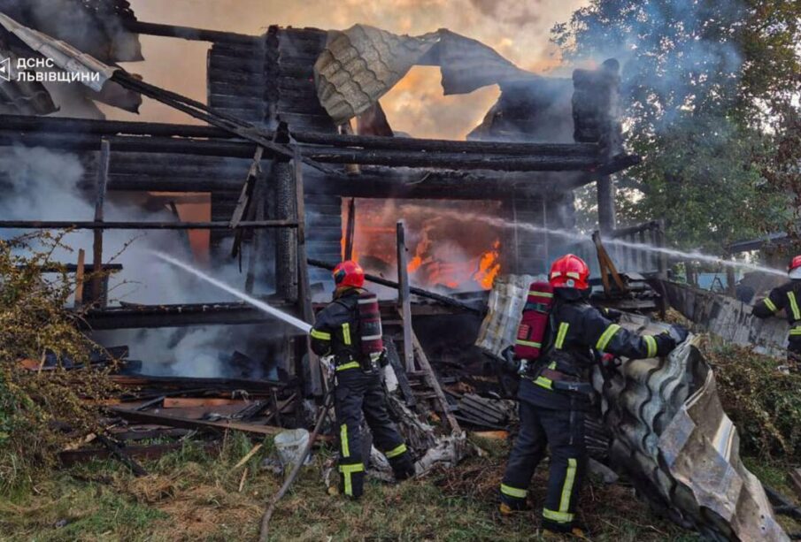 Ukrainian emergency workers use water hoses on a fire following a Russian air attack in Lviv on August 21, 2025. © Ukrainian Emergency Service via AFP