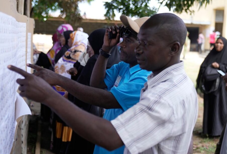 Voters verify their names before voting during the general elections at Mpendaye polling station in Zanzibar, Tanzania, Wednesday, Oct. 29, 2025. (AP Photo/Brian Inganga)