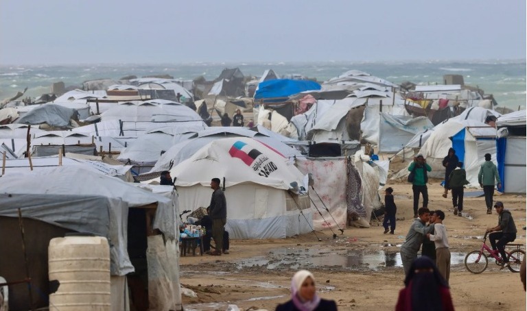 Displaces Palestinians walk near tents and makeshift shelters as the region experiences cold winter conditions in Al-Mawasi refuge camp in the southern Gaza Strip. (Photo by AFP)By Jim Watson with Danny Kemp in Washington AFP
