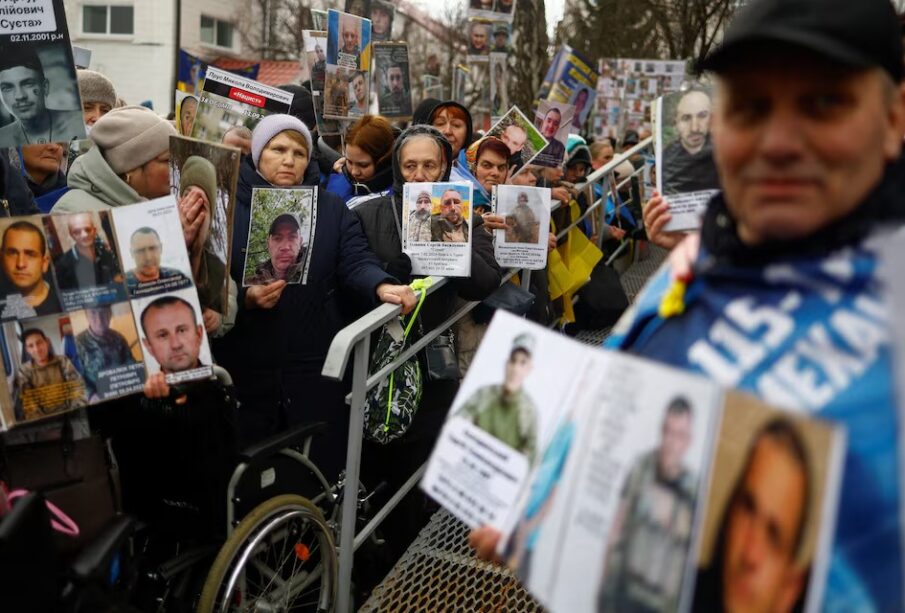 People hold portraits of their relatives, Ukrainian prisoners of war (POWs), hoping they will be recognized by other prisoners of war, who return after a swap, amid Russia's attack on Ukraine, in an undisclosed location, in Ukraine March 5, 2026. REUTERS/Valentyn OgirenkoUkraine and Russia exchanged 200 prisoners of war each on Thursday in their latest swap, officials on both sides said, despite a deadlock in U.S.-backed negotiations to end the four-year conflict.